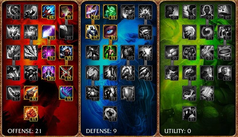 21 очко вкладываем в ветку «Offense», чтобы максимально увеличить магический урон, а 9 очков в ветку «Defense», для повышения выживаемости на линии.