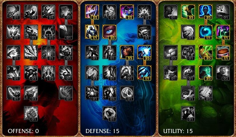 15 очков вкладываем в ветку «Defense», для повышения выживаемости на линии, а 15 очков – в ветку «Utility», чтобы повысить скорость передвижения, регенерацию маны, магический вампиризм, а также увеличить общий запас маны и продолжительность зелий и эликсиров. Поскольку мы будем собирать несколько предметов на ману, талант