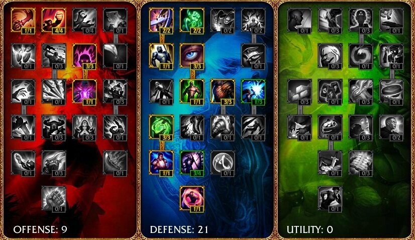 21 очко вкладываем в ветку «Defense», для максимального повышения нашей танковости, а 9 очков в ветку «Offense», чтобы повысить нашу скорость атаки и получить дополнительное AP, что увеличит наш урон и сделает нас более грозным оппонентом на линии.
